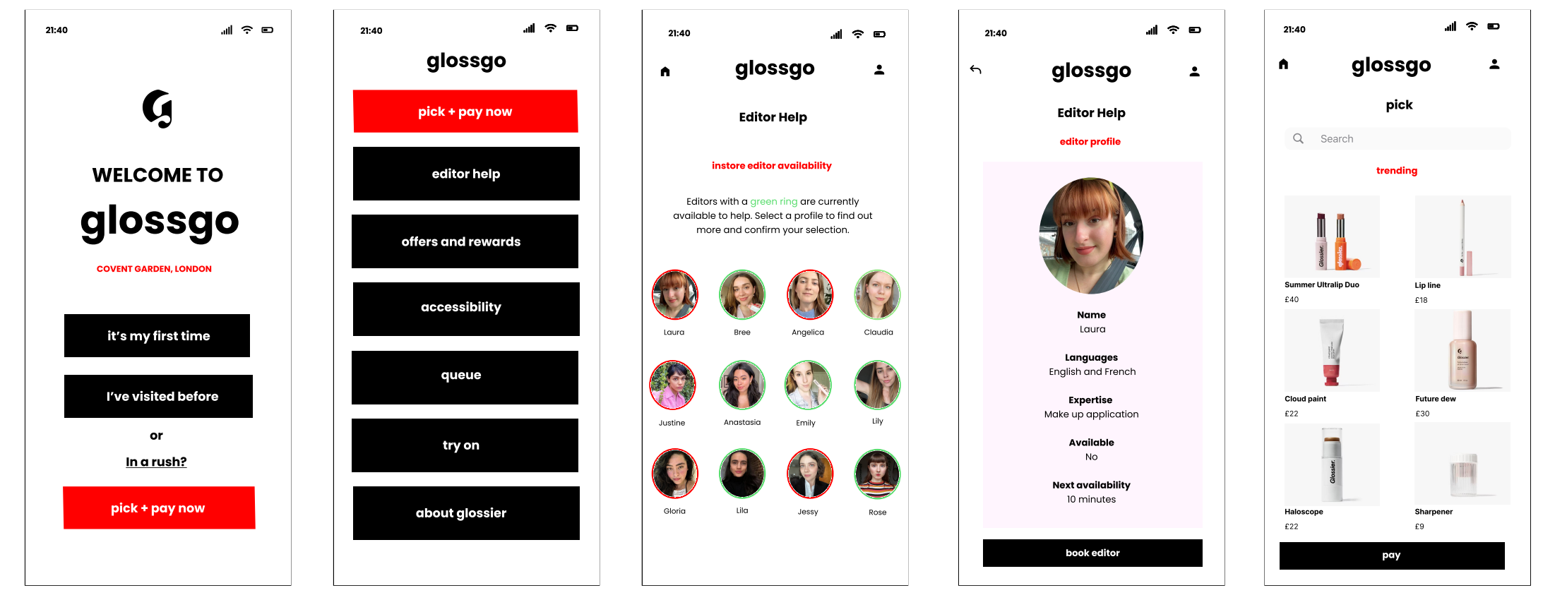 I had named the app glossgo, as I enjoyed the simplicity and half-rhyme, alliteration. I felt it fit well with Glossier’s branding, and signified quite well that the app’s purpose was to help you whilst on the go. However, my user’s couldn’t see past how it sounded very much like Costco, and thought it would have a similar premise to Pokemon Go. I scrapped this name pronto.