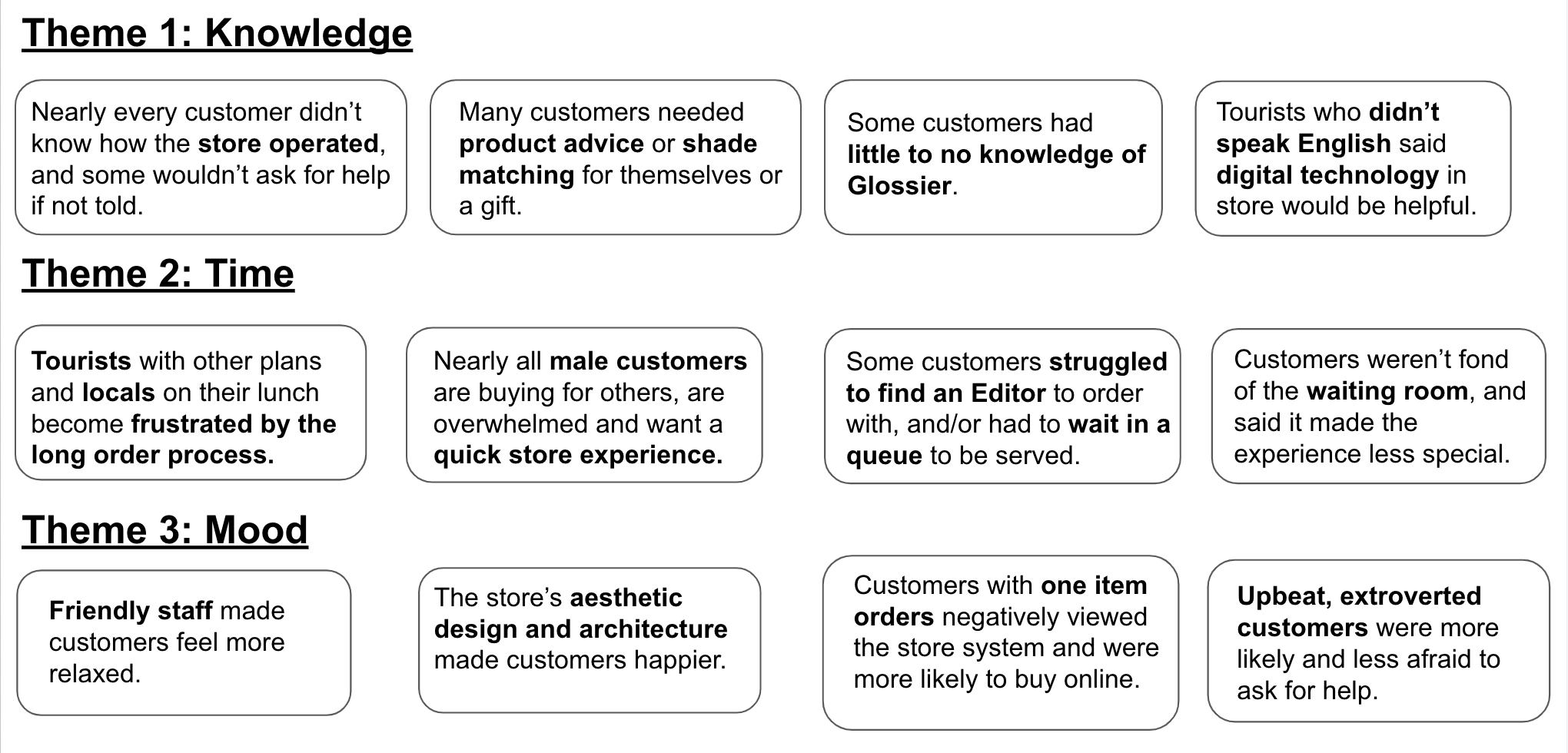 Using this method, I organised over 100 quotes into 12 insights, and three overarching themes which were knowledge, time and mood.